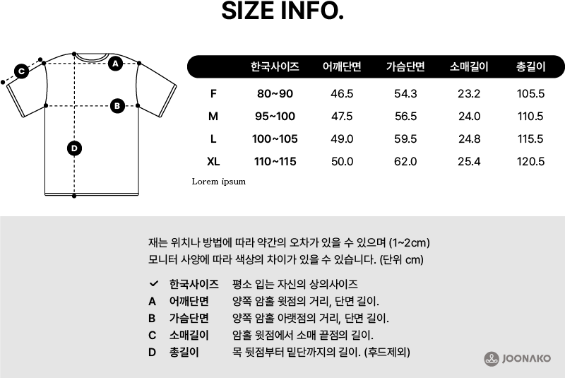 상의 사이즈를 고르는 가장 좋은 방법은 평소 입으시는 자신의 상의 사이즈 참고 하시고 '한국사이즈' 선택 하시면 됩니다.
